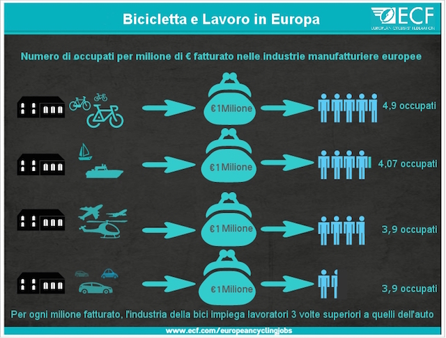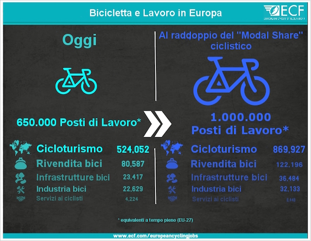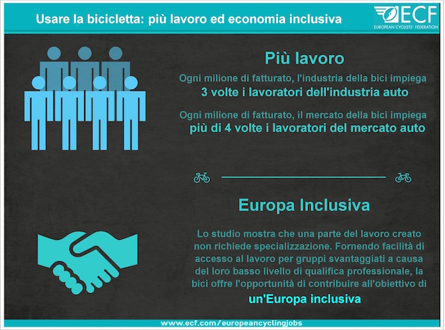 Per approfondire l’argomento si possono consultare i documenti integrali a questi link: Cycling Works Jobs and Job Creation in the Cycling Economy  –  Economic benefits of cycling in EU-27.