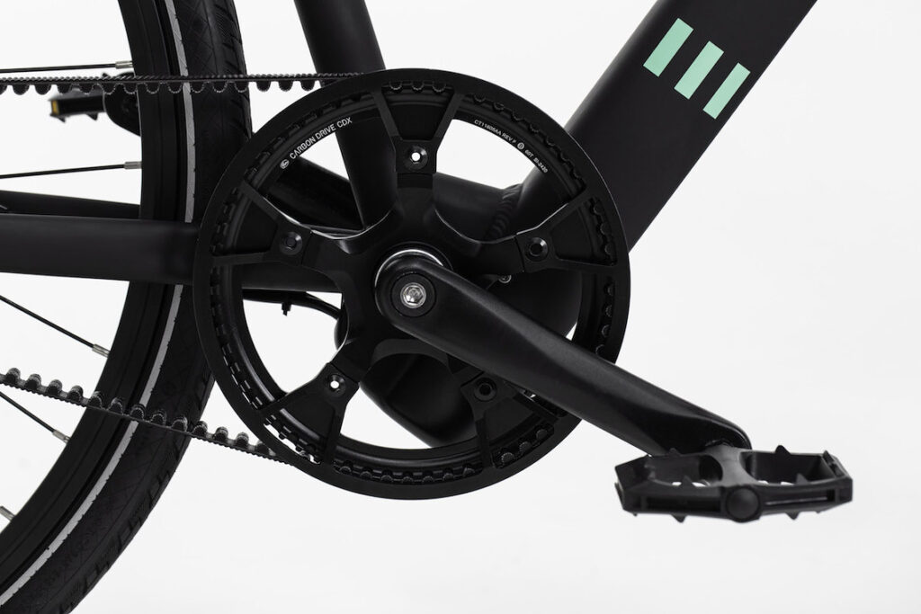 La Tenways CGO600 rientra in quella sotto categoria di e-bike “single speed”, cioè prive del tradizionale cambio meccanico da attivare manualmente (vedi anche Noko, MV Agusta, Cowboy 4, Gogoro Eeyo, VanMoof) . Il motore elettrico Mivice M070 da 250W, situato nel mozzo della ruota posteriore, è alimentato dalla batteria agli ioni di litio con celle Samsung/LG/Panasonic, nascosta nel tubo obliquo del telaio. La trasmissione è a cinghia con l’affidabile Gates Carbon Drive, che richiede quasi zero manutenzione, è silenziosa e non sporca.